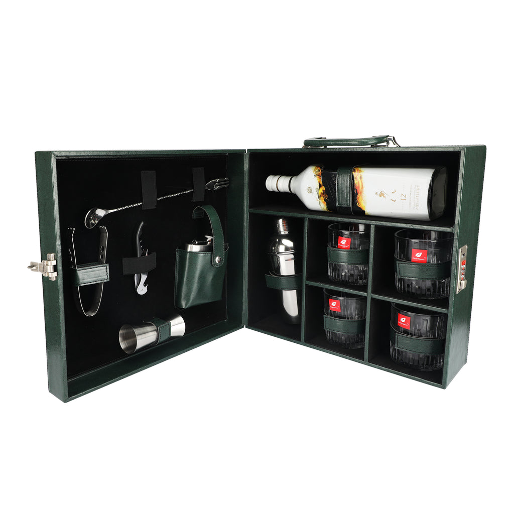 Anything & Everything Bar Set | Wine Case | Whisky Case | Portable Bar Accessories Set (Holds 01 Bottle & 04 Whisky Glasses) (Green)